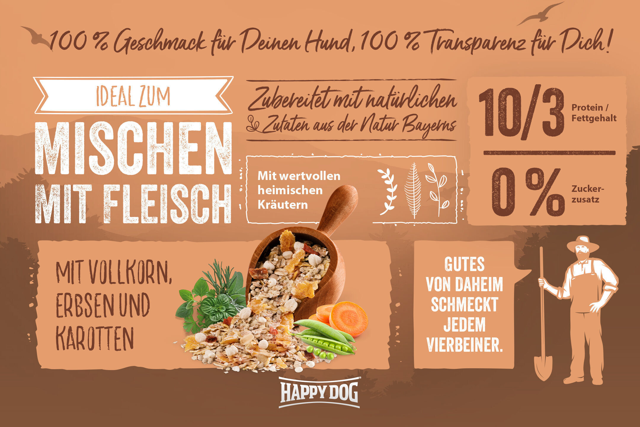 Formula Happy Dog NaturCroq Flocken-Mixer conține fulgi fini și fulgi integrali atent selecționați, legume și plante, fiind îmbogățită cu toate vitaminele și mineralele necesare unei nutriții complete. Morcovii și mazărea contribuie cu fibre importante, betacaroten și proteine vegetale de calitate.