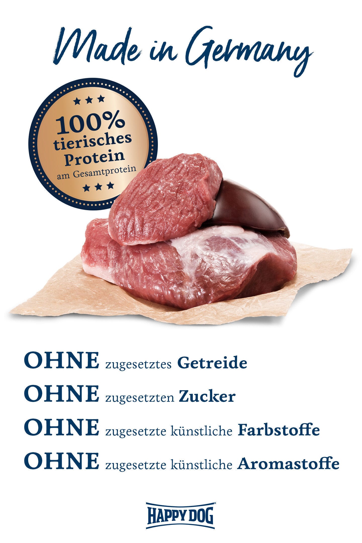Poate fi oferită ca aliment complet în formă pură, integrată în mese gătite acasă sau combinată cu Happy Dog Flocken-Mixer, care aduce fibre din legume și carbohidrați ca sursă de energie. Pentru mai multă varietate, poți înlocui o parte din hrana uscată cu hrană umedă, oferind câinelui momente noi de răsfăț.
