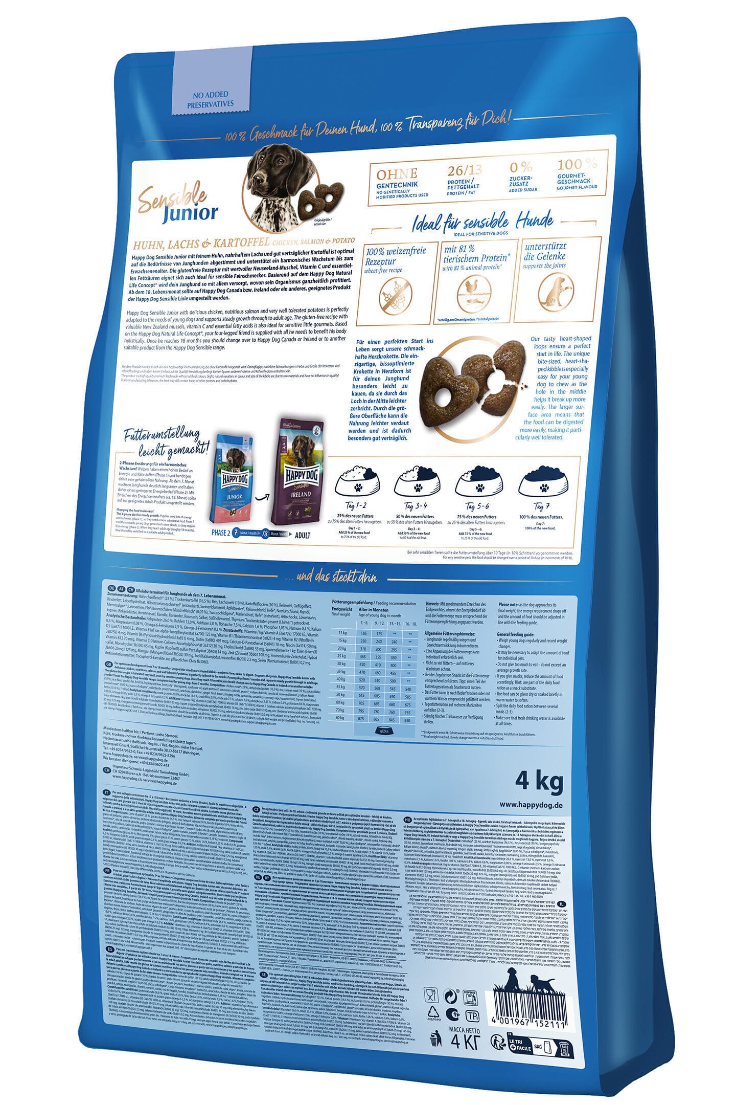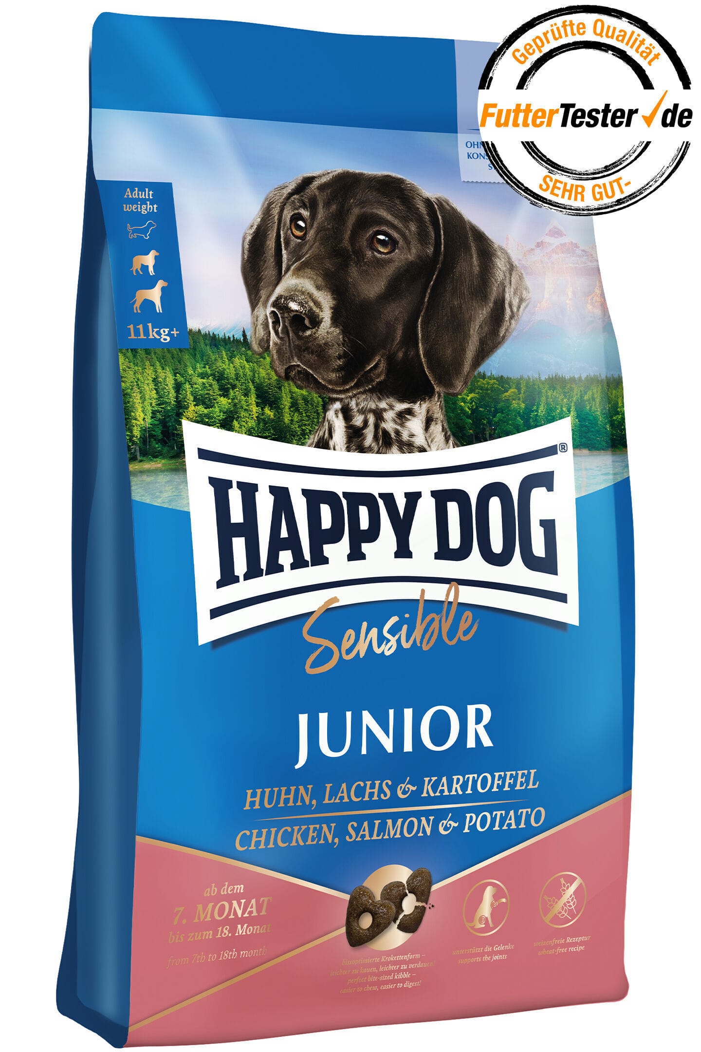 Happy Dog Sensible Junior Huhn, Lachs & Kartoffel este o hrană completă, fără gluten, special concepută pentru câinii juniori sensibili, de la 7 până la 18 luni, din rase medii și mari cu greutate adultă de la 11 kg. Această formulă echilibrată combină pui gustos, somon hrănitor și cartof bine tolerat, oferind o nutriție completă, gustoasă și ușor digerabilă, adaptată nevoilor unui ritm de creștere mai lent.